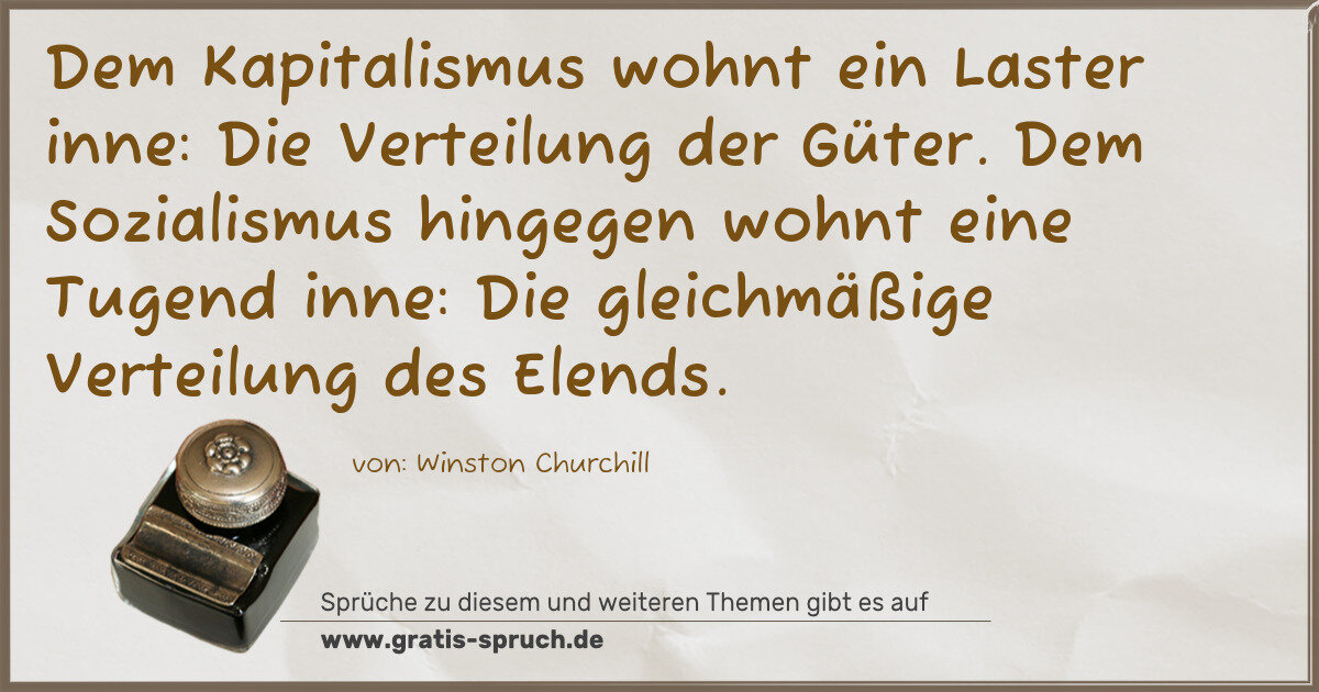 Dem Kapitalismus wohnt ein Laster inne: Die Verteilung der Güter. Dem Sozialismus hingegen wohnt eine Tugend inne: Die gleichmäßige Verteilung des Elends.