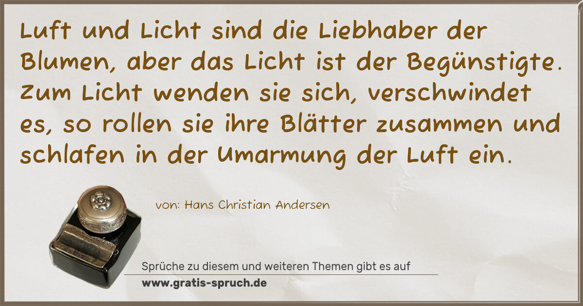 Luft und Licht sind die Liebhaber der Blumen, aber das Licht ist der Begünstigte. Zum Licht wenden sie sich, verschwindet es, so rollen sie ihre Blätter zusammen und schlafen in der Umarmung der Luft ein.