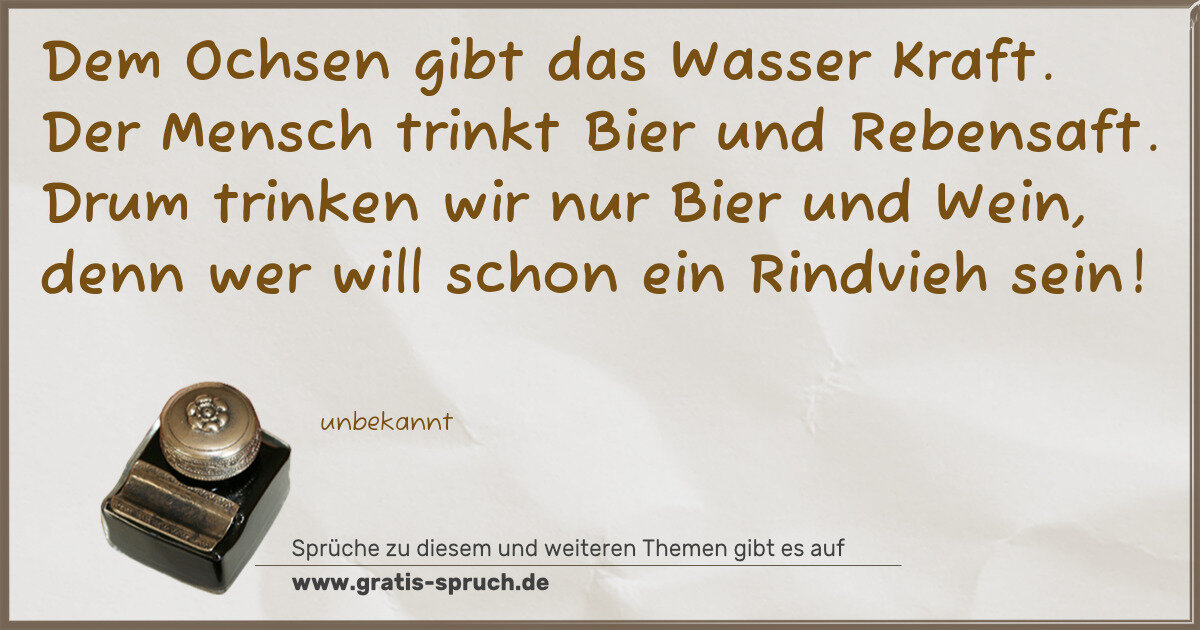 Dem Ochsen gibt das Wasser Kraft. Der Mensch trinkt Bier und Rebensaft. Drum trinken wir nur Bier und Wein, denn wer will schon ein Rindvieh sein!