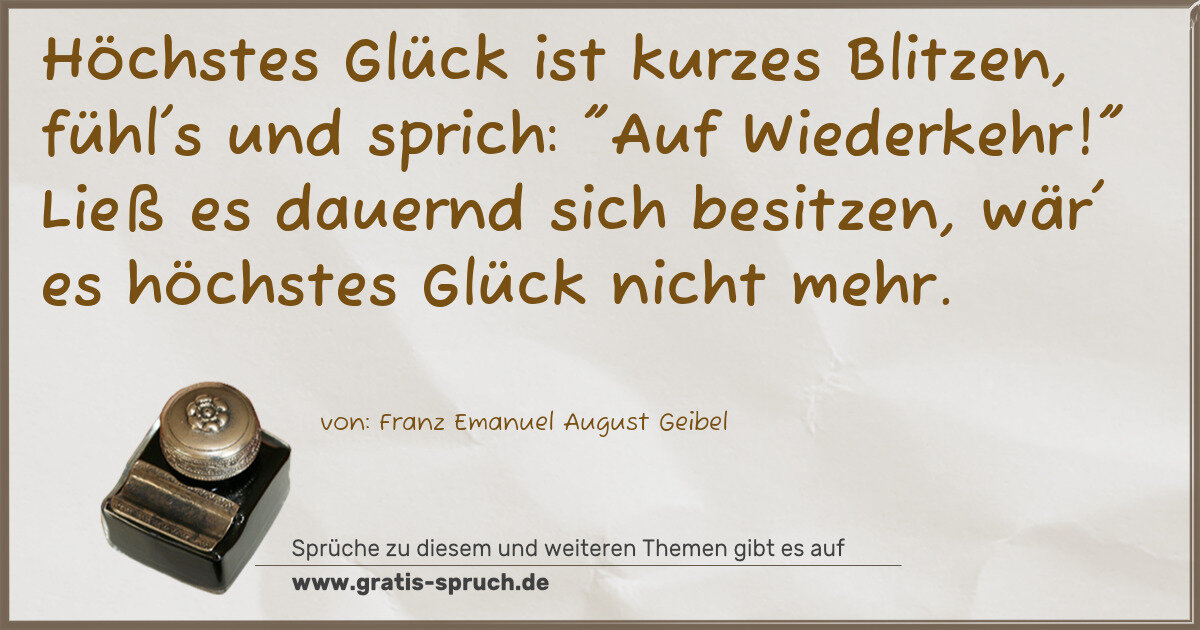 Höchstes Glück ist kurzes Blitzen, fühl's und sprich: "Auf Wiederkehr!" Ließ es dauernd sich besitzen, wär' es höchstes Glück nicht mehr.