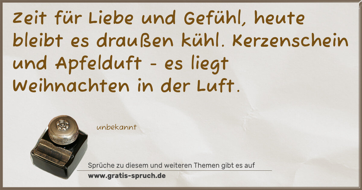 Zeit für Liebe und Gefühl, heute bleibt es draußen kühl. Kerzenschein und Apfelduft - es liegt Weihnachten in der Luft.