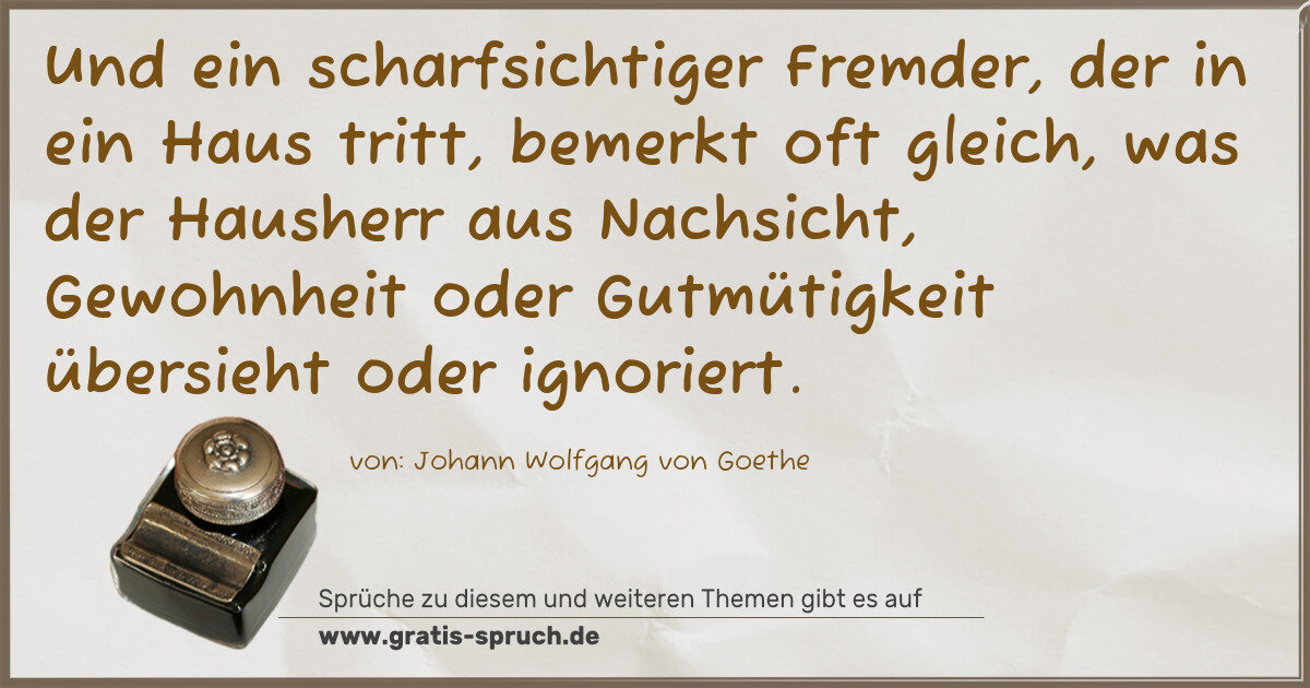 Und ein scharfsichtiger Fremder, der in ein Haus tritt, bemerkt oft gleich, was der Hausherr aus Nachsicht, Gewohnheit oder Gutmütigkeit übersieht oder ignoriert.