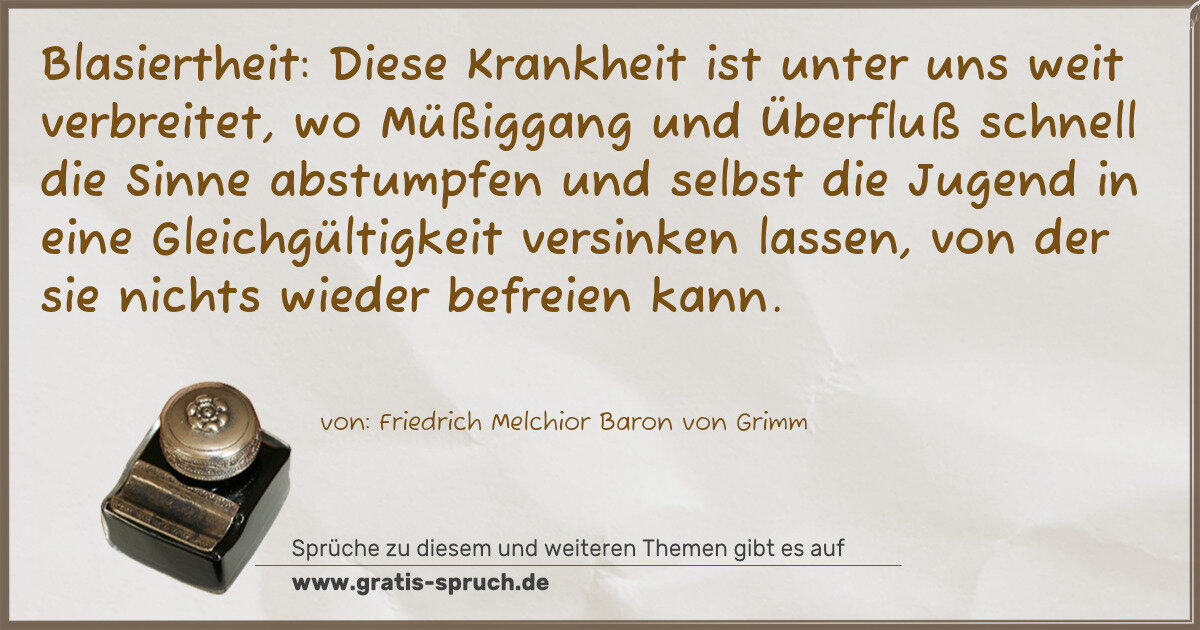 Blasiertheit: Diese Krankheit ist unter uns weit verbreitet, wo Müßiggang und Überfluß schnell die Sinne abstumpfen und selbst die Jugend in eine Gleichgültigkeit versinken lassen, von der sie nichts wieder befreien kann.