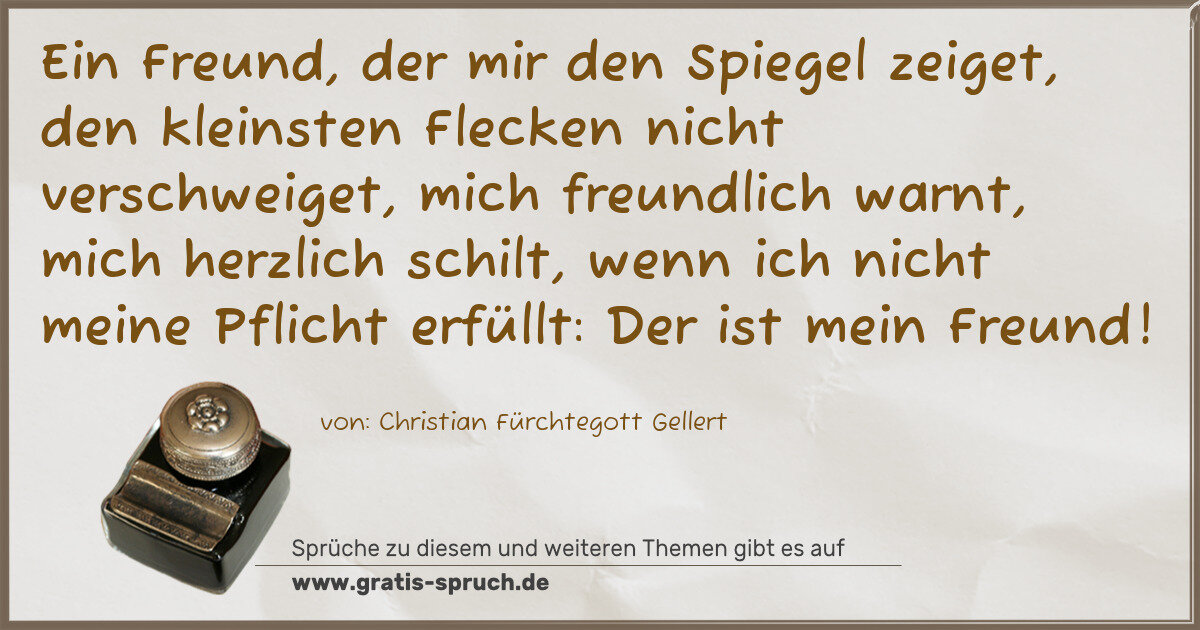Ein Freund, der mir den Spiegel zeiget, den kleinsten Flecken nicht verschweiget, mich freundlich warnt, mich herzlich schilt, wenn ich nicht meine Pflicht erfüllt: Der ist mein Freund!