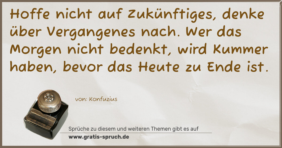 Hoffe nicht auf Zukünftiges, denke über Vergangenes nach. Wer das Morgen nicht bedenkt, wird Kummer haben, bevor das Heute zu Ende ist.