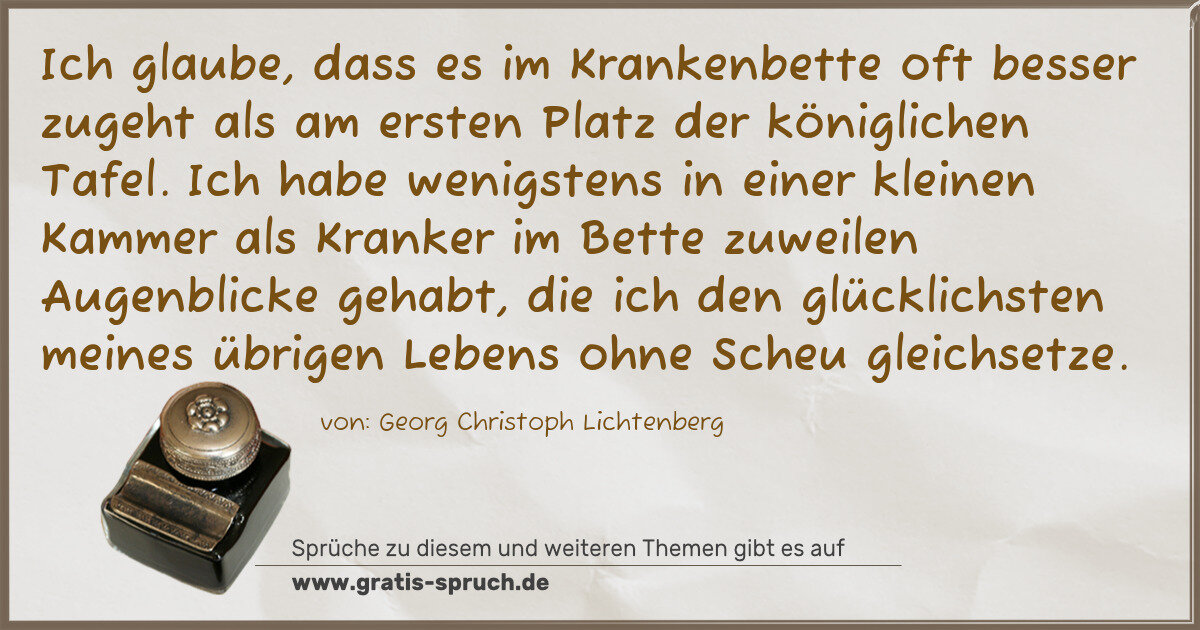 Ich glaube, dass es im Krankenbette oft besser zugeht als am ersten Platz der königlichen Tafel. Ich habe wenigstens in einer kleinen Kammer als Kranker im Bette zuweilen Augenblicke gehabt, die ich den glücklichsten meines übrigen Lebens ohne Scheu gleichsetze.