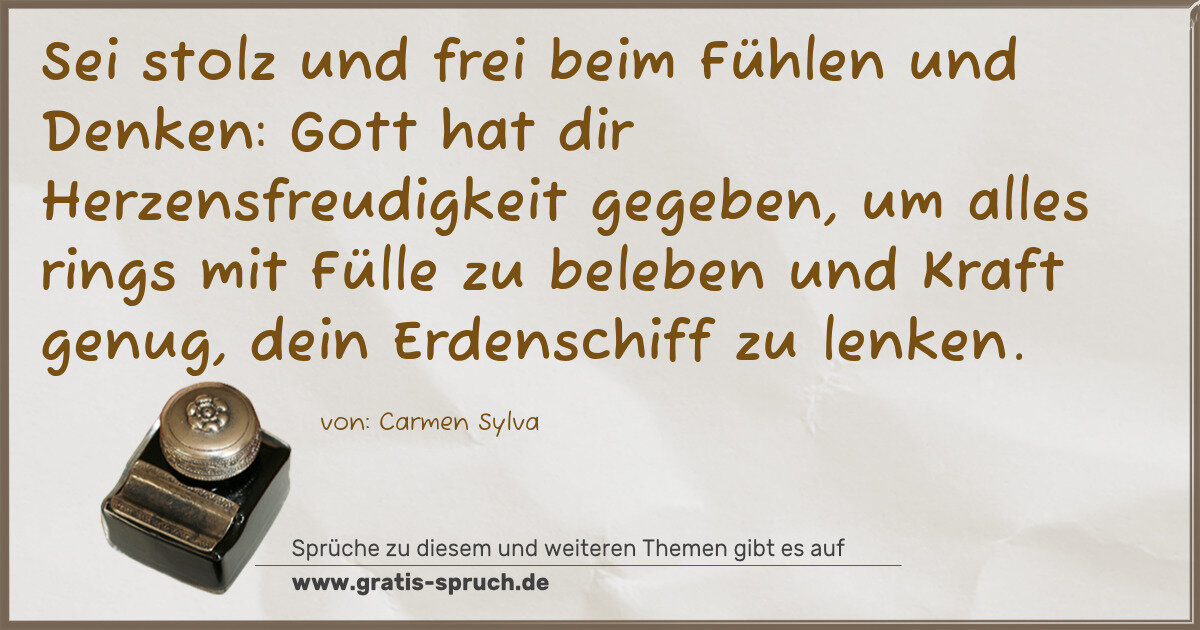Sei stolz und frei beim Fühlen und Denken: Gott hat dir Herzensfreudigkeit gegeben, um alles rings mit Fülle zu beleben und Kraft genug, dein Erdenschiff zu lenken.