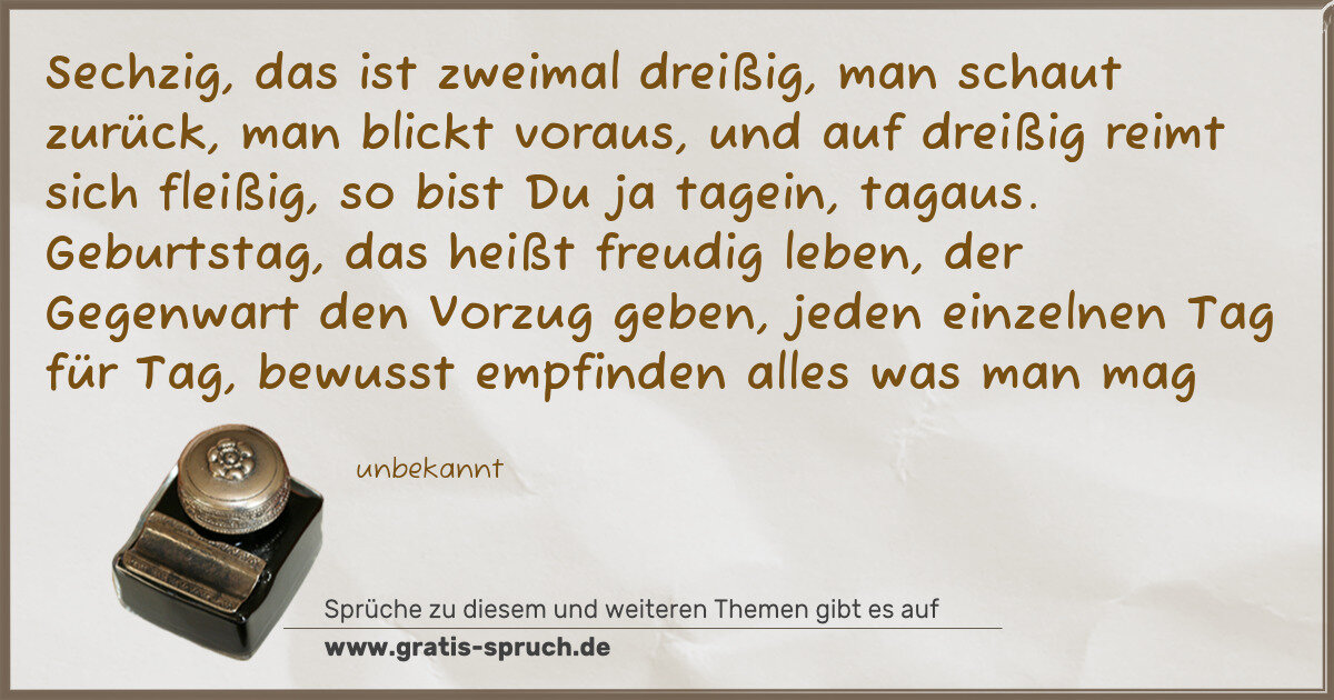 Sechzig, das ist zweimal dreißig, man schaut zurück, man blickt voraus, und auf dreißig reimt sich fleißig, so bist Du ja tagein, tagaus. Geburtstag, das heißt freudig leben, der Gegenwart den Vorzug geben, jeden einzelnen Tag für Tag, bewusst empfinden alles was man mag