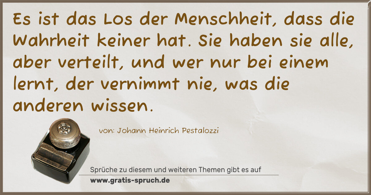 Es ist das Los der Menschheit, dass die Wahrheit keiner hat. Sie haben sie alle, aber verteilt, und wer nur bei einem lernt, der vernimmt nie, was die anderen wissen.
