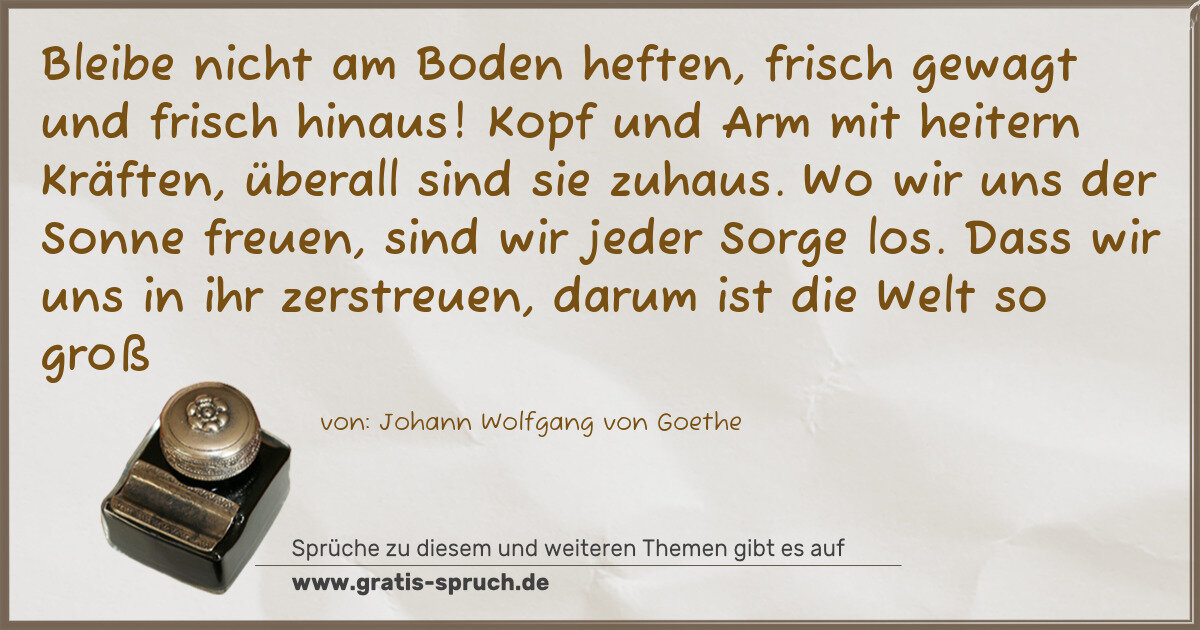Bleibe nicht am Boden heften, frisch gewagt und frisch hinaus! Kopf und Arm mit heitern Kräften, überall sind sie zuhaus. Wo wir uns der Sonne freuen, sind wir jeder Sorge los. Dass wir uns in ihr zerstreuen, darum ist die Welt so groß