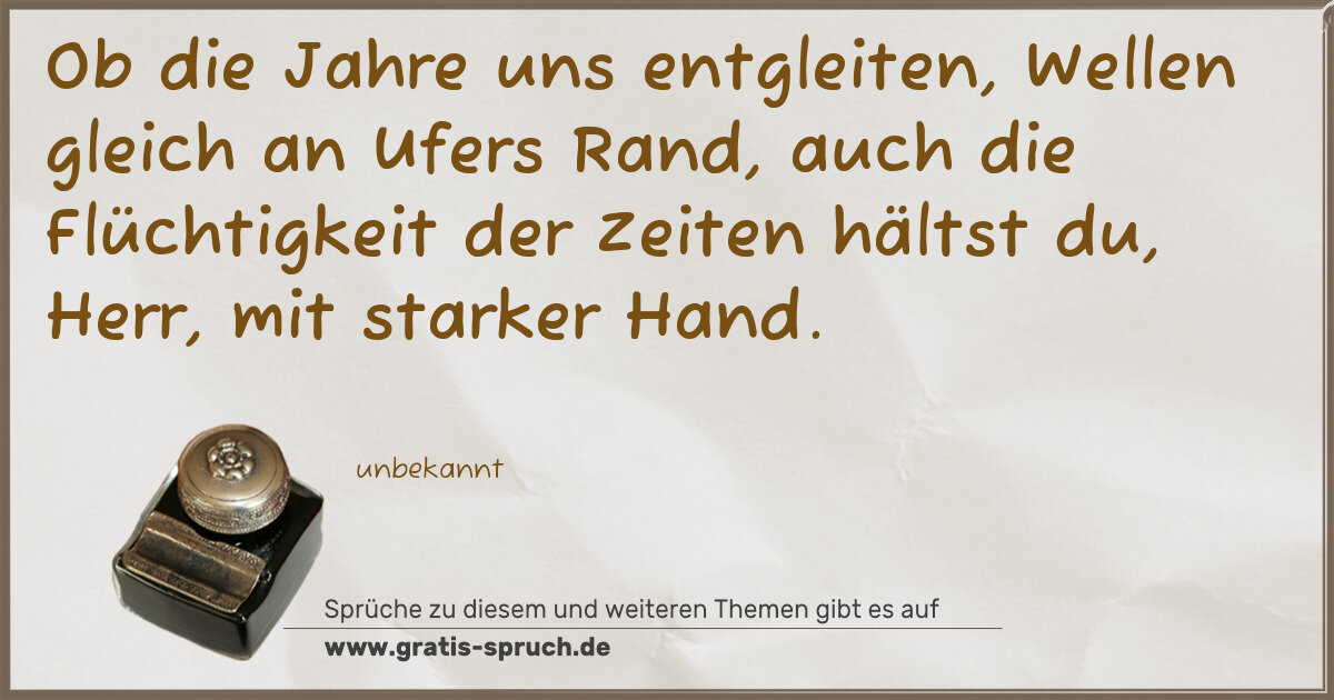Ob die Jahre uns entgleiten, Wellen gleich an Ufers Rand, auch die Flüchtigkeit der Zeiten hältst du, Herr, mit starker Hand.