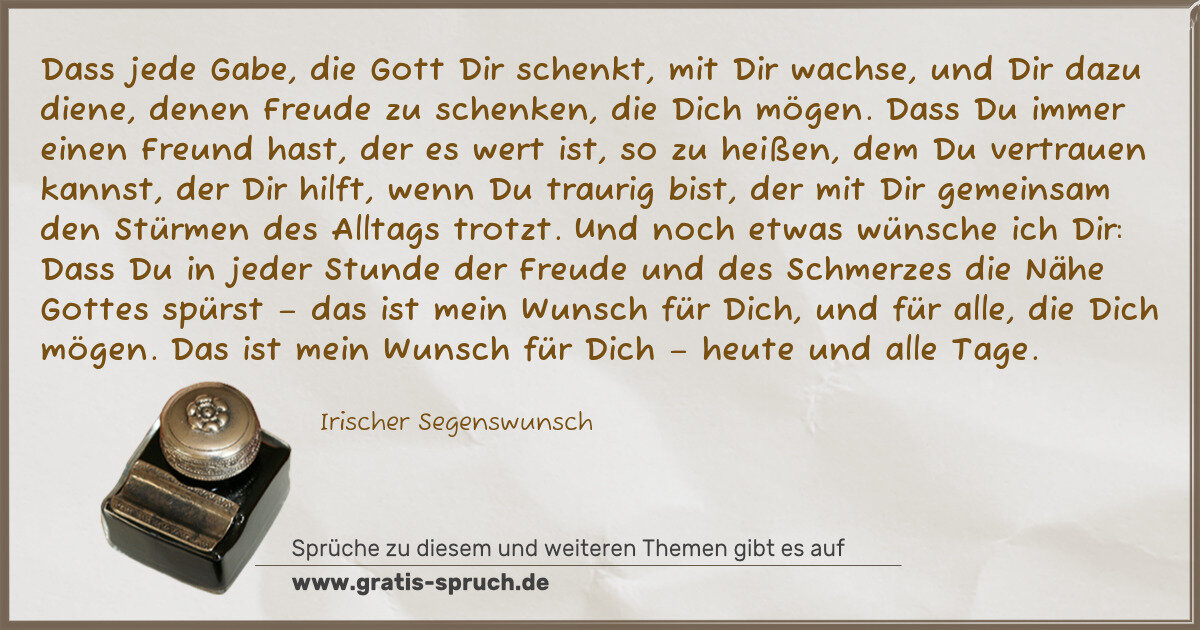 Dass jede Gabe, die Gott Dir schenkt, mit Dir wachse, und Dir dazu diene, denen Freude zu schenken, die Dich mögen. Dass Du immer einen Freund hast, der es wert ist, so zu heißen, dem Du vertrauen kannst, der Dir hilft, wenn Du traurig bist, der mit Dir gemeinsam den Stürmen des Alltags trotzt. Und noch etwas wünsche ich Dir: Dass Du in jeder Stunde der Freude und des Schmerzes die Nähe Gottes spürst – das ist mein Wunsch für Dich, und für alle, die Dich mögen. Das ist mein Wunsch für Dich – heute und alle Tage.