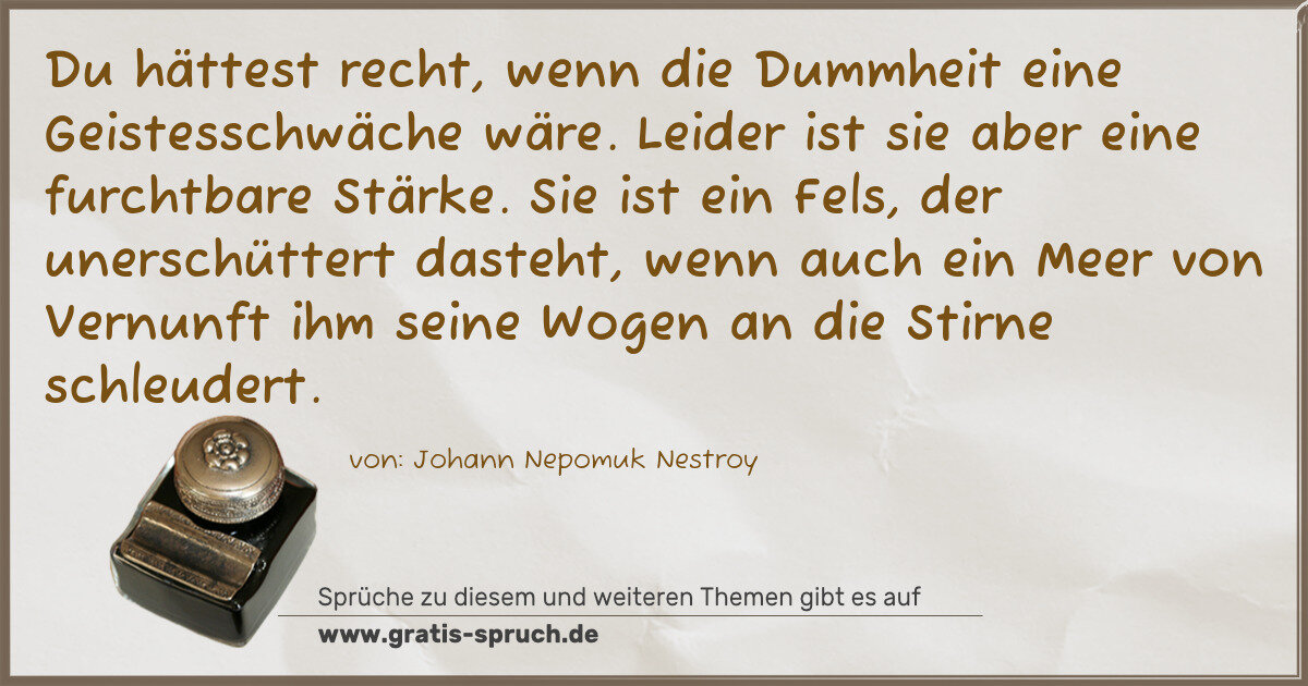 Du hättest recht, wenn die Dummheit eine Geistesschwäche wäre. Leider ist sie aber eine furchtbare Stärke. Sie ist ein Fels, der unerschüttert dasteht, wenn auch ein Meer von Vernunft ihm seine Wogen an die Stirne schleudert.