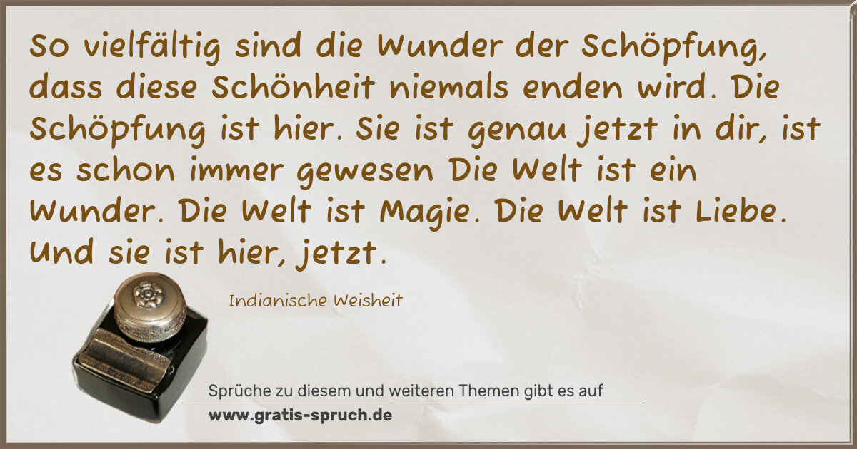 So vielfältig sind die Wunder der Schöpfung, dass diese Schönheit niemals enden wird. Die Schöpfung ist hier. Sie ist genau jetzt in dir, ist es schon immer gewesen Die Welt ist ein Wunder. Die Welt ist Magie. Die Welt ist Liebe. Und sie ist hier, jetzt.