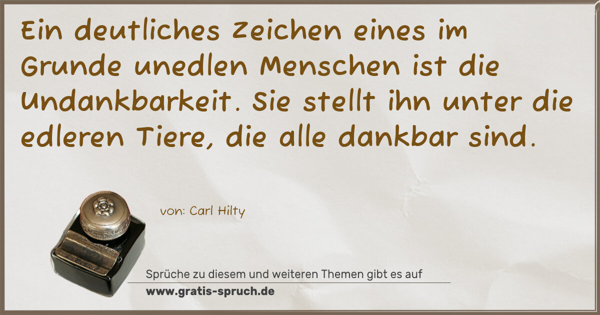 Ein deutliches Zeichen eines im Grunde unedlen Menschen ist die Undankbarkeit. Sie stellt ihn unter die edleren Tiere, die alle dankbar sind.