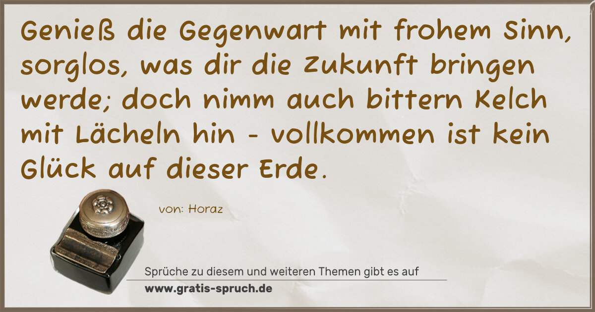 Genieß die Gegenwart mit frohem Sinn, sorglos, was dir die Zukunft bringen werde; doch nimm auch bittern Kelch mit Lächeln hin - vollkommen ist kein Glück auf dieser Erde.