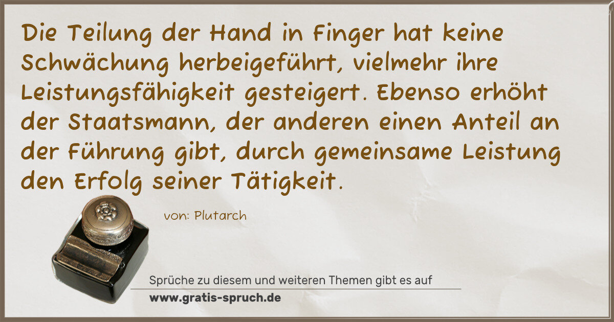 Die Teilung der Hand in Finger hat keine Schwächung herbeigeführt, vielmehr ihre Leistungsfähigkeit gesteigert. Ebenso erhöht der Staatsmann, der anderen einen Anteil an der Führung gibt, durch gemeinsame Leistung den Erfolg seiner Tätigkeit.