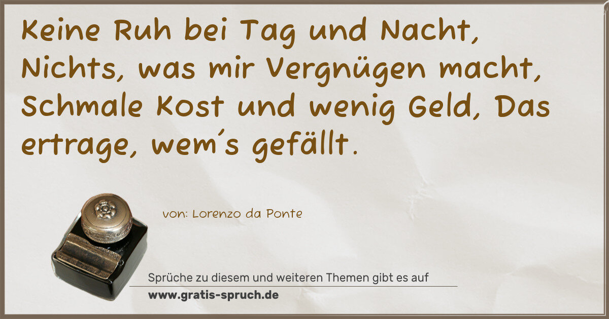 Keine Ruh bei Tag und Nacht, Nichts, was mir Vergnügen macht, Schmale Kost und wenig Geld, Das ertrage, wem's gefällt.