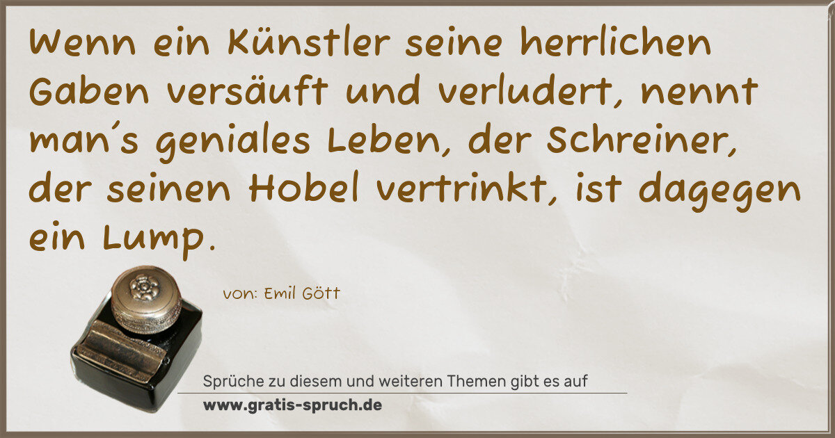 Wenn ein Künstler seine herrlichen Gaben versäuft und verludert, nennt man's geniales Leben, der Schreiner, der seinen Hobel vertrinkt, ist dagegen ein Lump.