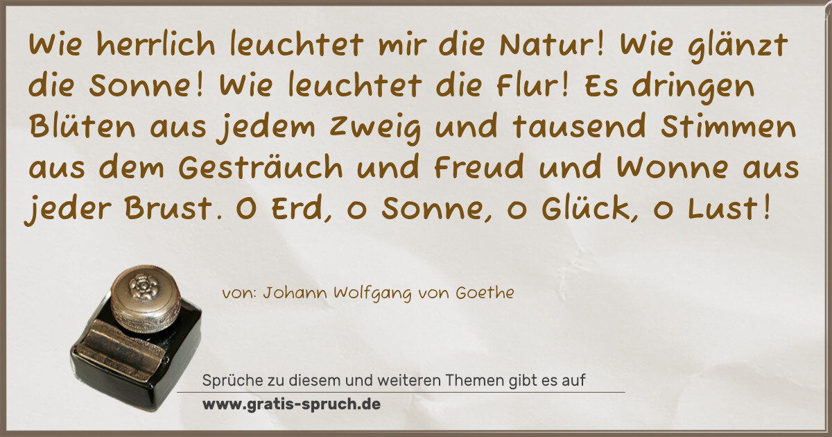 Wie herrlich leuchtet mir die Natur! Wie glänzt die Sonne! Wie leuchtet die Flur! Es dringen Blüten aus jedem Zweig und tausend Stimmen aus dem Gesträuch und Freud und Wonne aus jeder Brust. O Erd, o Sonne, o Glück, o Lust!