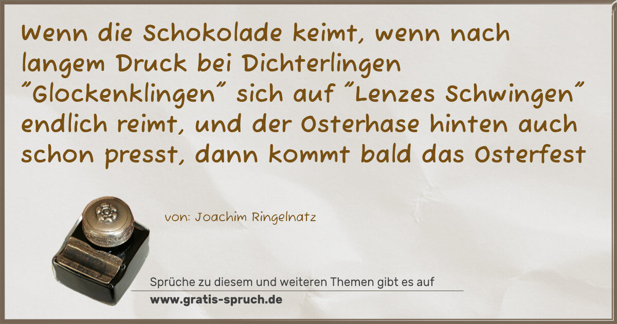 Wenn die Schokolade keimt, wenn nach langem Druck bei Dichterlingen "Glockenklingen" sich auf "Lenzes Schwingen" endlich reimt, und der Osterhase hinten auch schon presst, dann kommt bald das Osterfest