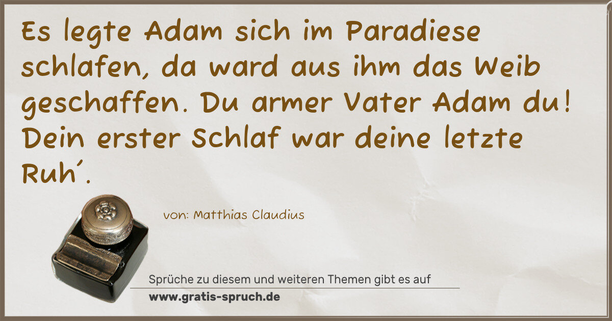 Es legte Adam sich im Paradiese schlafen, da ward aus ihm das Weib geschaffen. Du armer Vater Adam du! Dein erster Schlaf war deine letzte Ruh'.