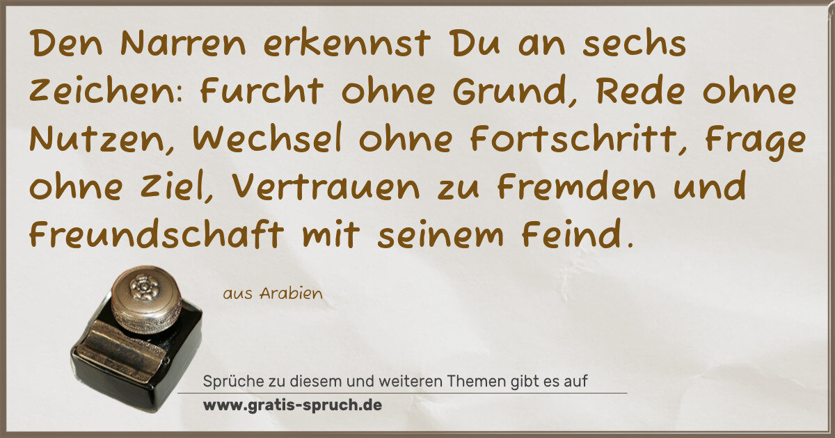 Den Narren erkennst Du an sechs Zeichen: Furcht ohne Grund, Rede ohne Nutzen, Wechsel ohne Fortschritt, Frage ohne Ziel, Vertrauen zu Fremden und Freundschaft mit seinem Feind.