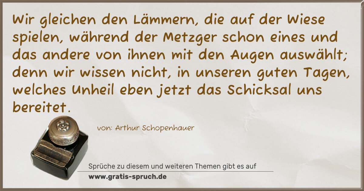 Wir gleichen den Lämmern, die auf der Wiese spielen, während der Metzger schon eines und das andere von ihnen mit den Augen auswählt; denn wir wissen nicht, in unseren guten Tagen, welches Unheil eben jetzt das Schicksal uns bereitet.