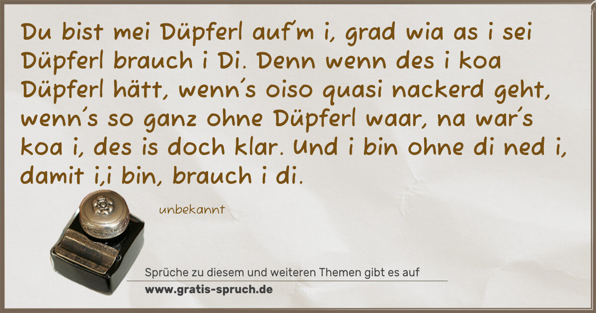 Du bist mei Düpferl auf'm i, grad wia as i sei Düpferl brauch i Di. Denn wenn des i koa Düpferl hätt, wenn's oiso quasi nackerd geht, wenn's so ganz ohne Düpferl waar, na war's koa i, des is doch klar. Und i bin ohne di ned i, damit i,i bin, brauch i di.