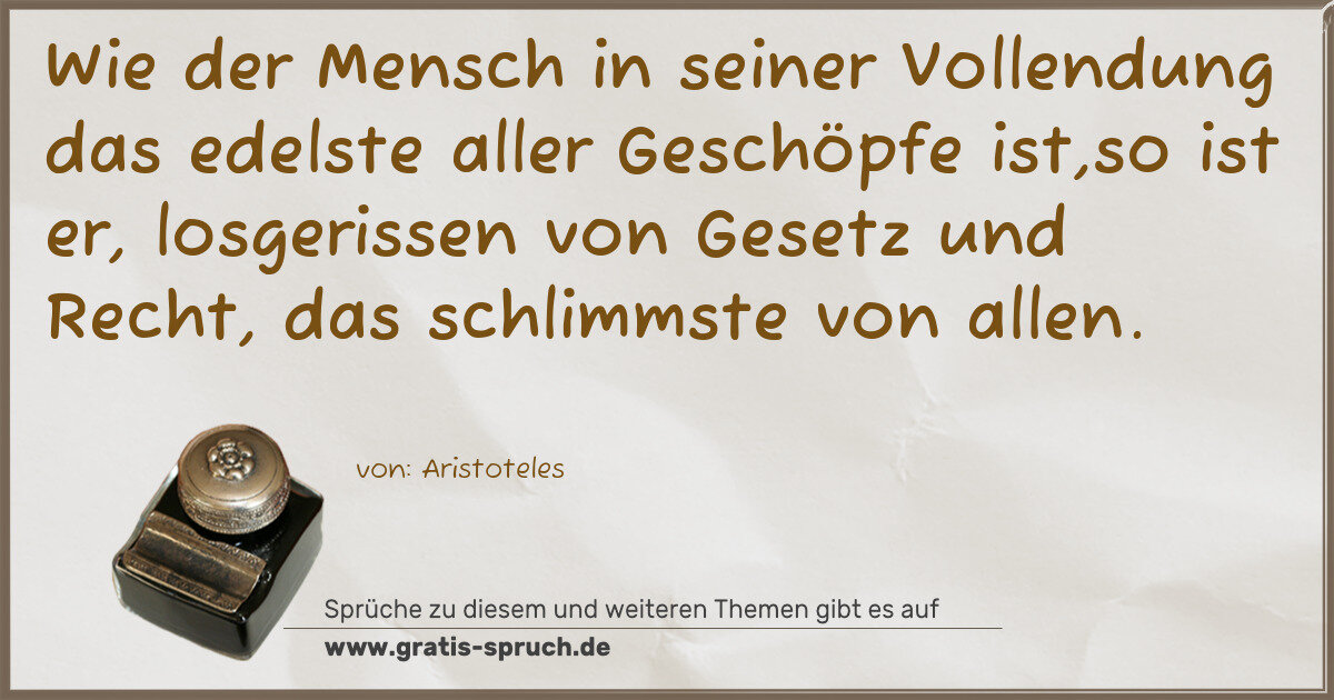 Wie der Mensch in seiner Vollendung das edelste aller Geschöpfe ist,so ist er, losgerissen von Gesetz und Recht, das schlimmste von allen.