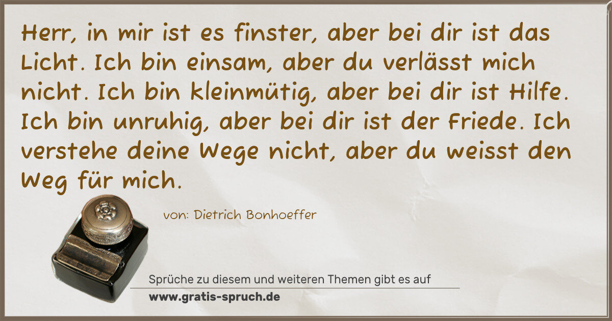 Herr, in mir ist es finster, aber bei dir ist das Licht. Ich bin einsam, aber du verlässt mich nicht. Ich bin kleinmütig, aber bei dir ist Hilfe. Ich bin unruhig, aber bei dir ist der Friede. Ich verstehe deine Wege nicht, aber du weisst den Weg für mich.