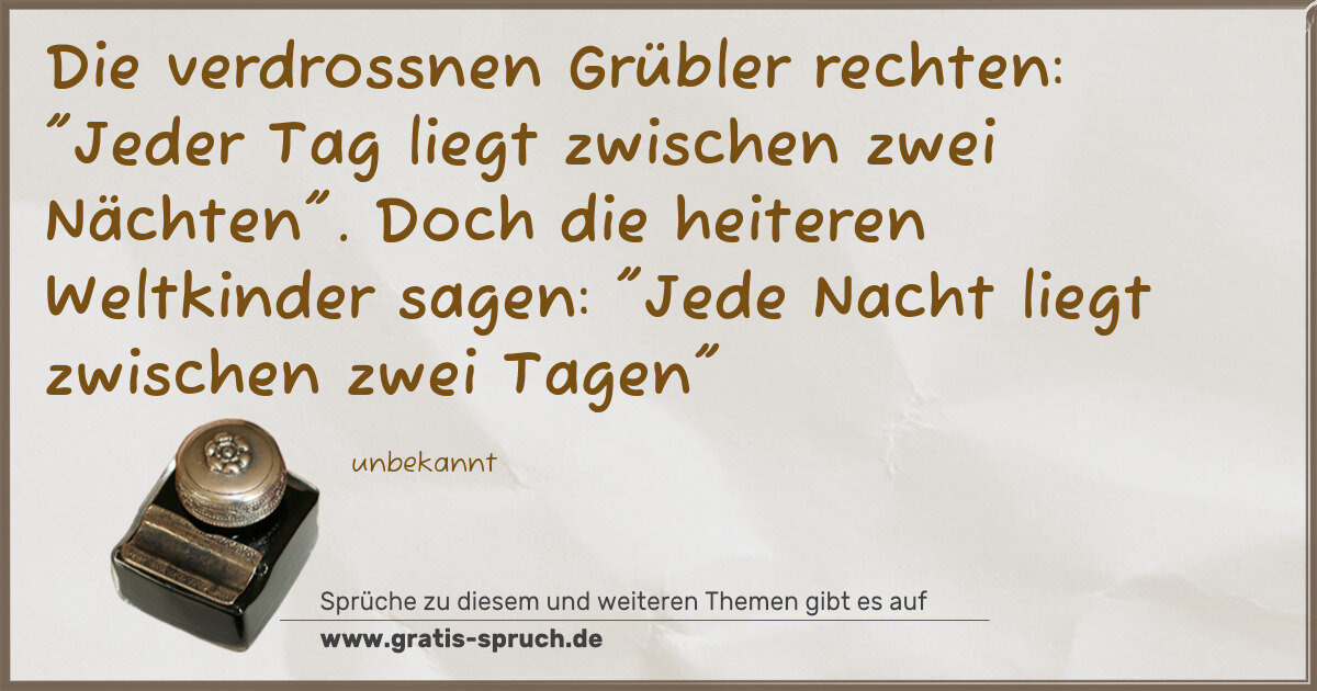 Die verdrossnen Grübler rechten: "Jeder Tag liegt zwischen zwei Nächten". Doch die heiteren Weltkinder sagen: "Jede Nacht liegt zwischen zwei Tagen"