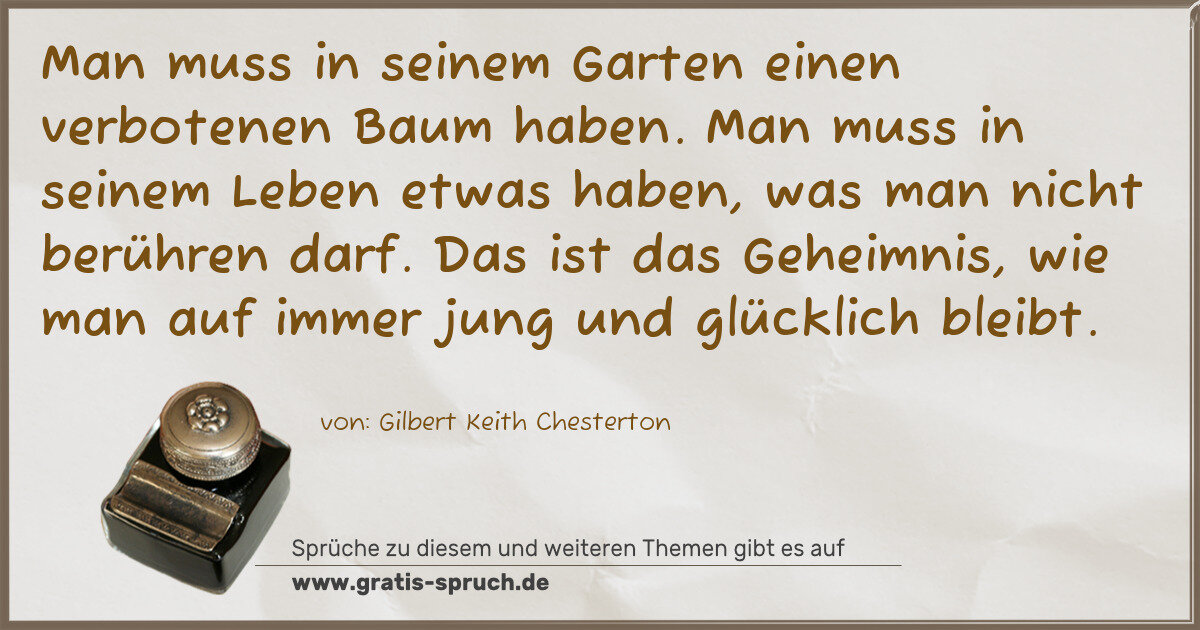 Man muss in seinem Garten einen verbotenen Baum haben. Man muss in seinem Leben etwas haben, was man nicht berühren darf. Das ist das Geheimnis, wie man auf immer jung und glücklich bleibt.