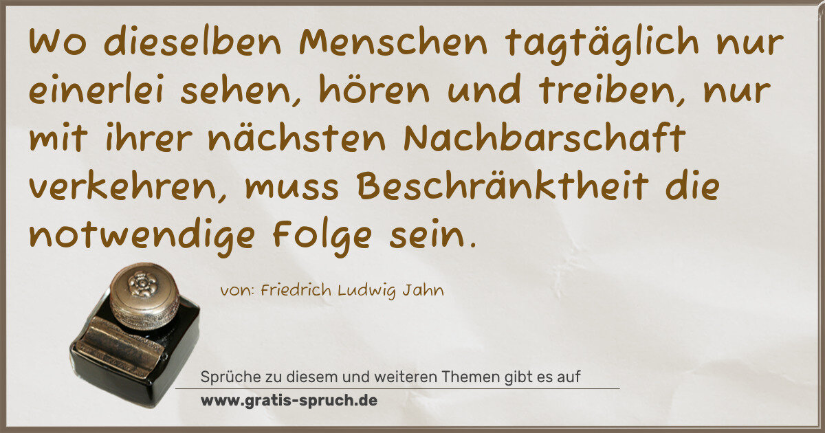 Wo dieselben Menschen tagtäglich nur einerlei sehen, hören und treiben, nur mit ihrer nächsten Nachbarschaft verkehren, muss Beschränktheit die notwendige Folge sein.