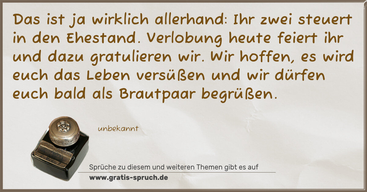 Das ist ja wirklich allerhand: Ihr zwei steuert in den Ehestand. Verlobung heute feiert ihr und dazu gratulieren wir. Wir hoffen, es wird euch das Leben versüßen und wir dürfen euch bald als Brautpaar begrüßen.