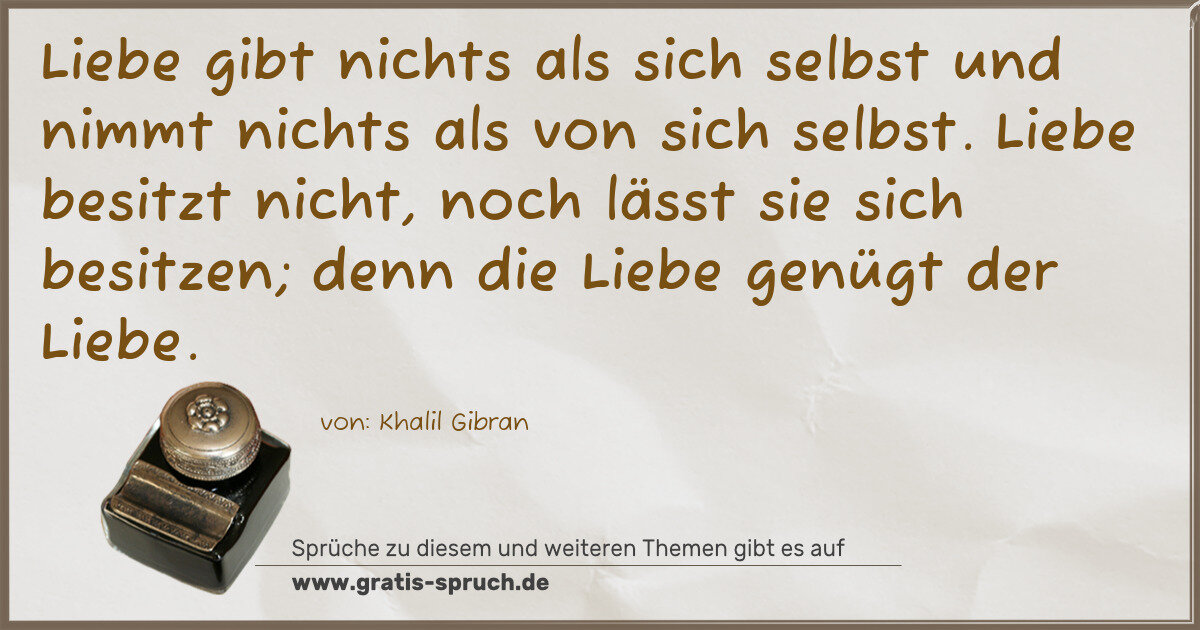 Liebe gibt nichts als sich selbst und nimmt nichts als von sich selbst. Liebe besitzt nicht, noch lässt sie sich besitzen; denn die Liebe genügt der Liebe.