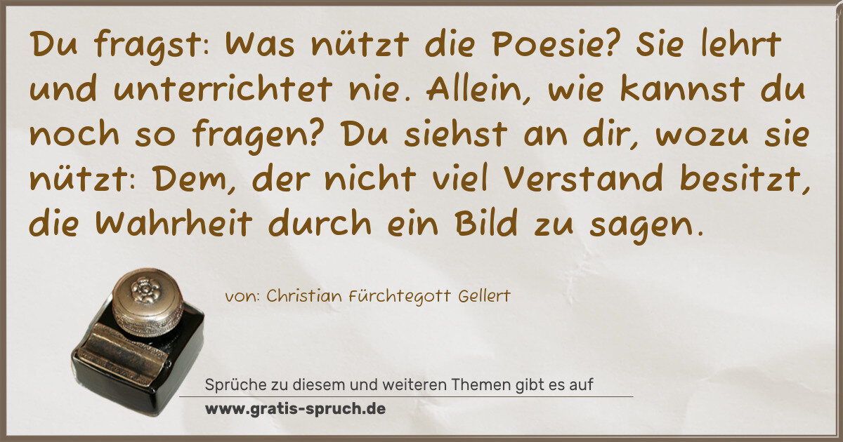 Du fragst: Was nützt die Poesie? Sie lehrt und unterrichtet nie. Allein, wie kannst du noch so fragen? Du siehst an dir, wozu sie nützt: Dem, der nicht viel Verstand besitzt, die Wahrheit durch ein Bild zu sagen.