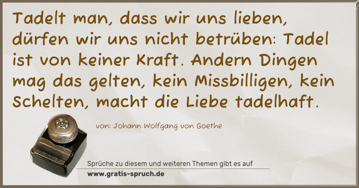 Tadelt man, dass wir uns lieben, dürfen wir uns nicht betrüben: Tadel ist von keiner Kraft. Andern Dingen mag das gelten, kein Missbilligen, kein Schelten, macht die Liebe tadelhaft.
