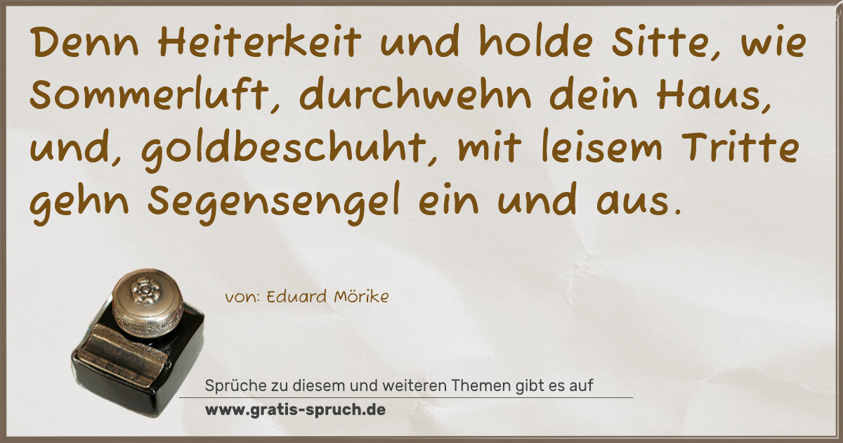 Denn Heiterkeit und holde Sitte, wie Sommerluft, durchwehn dein Haus, und, goldbeschuht, mit leisem Tritte gehn Segensengel ein und aus.