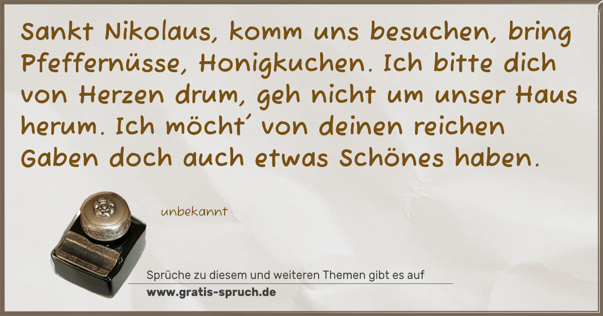 Sankt Nikolaus, komm uns besuchen, bring Pfeffernüsse, Honigkuchen. Ich bitte dich von Herzen drum, geh nicht um unser Haus herum. Ich möcht' von deinen reichen Gaben doch auch etwas Schönes haben.