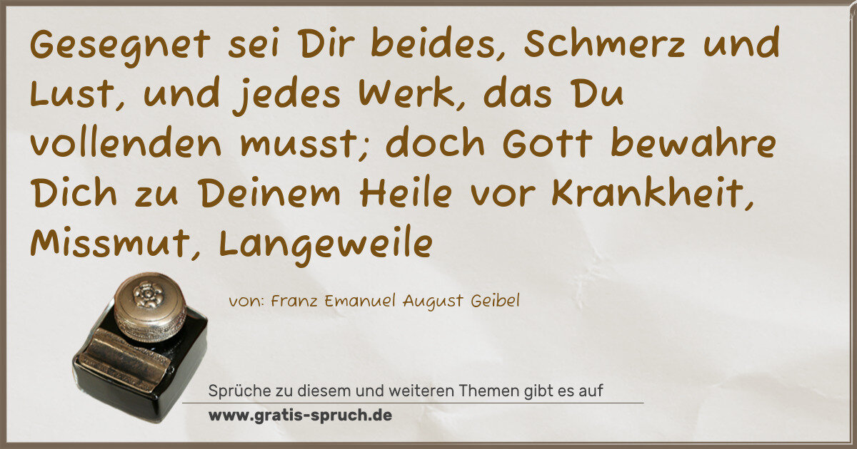 Gesegnet sei Dir beides, Schmerz und Lust, und jedes Werk, das Du vollenden musst; doch Gott bewahre Dich zu Deinem Heile vor Krankheit, Missmut, Langeweile