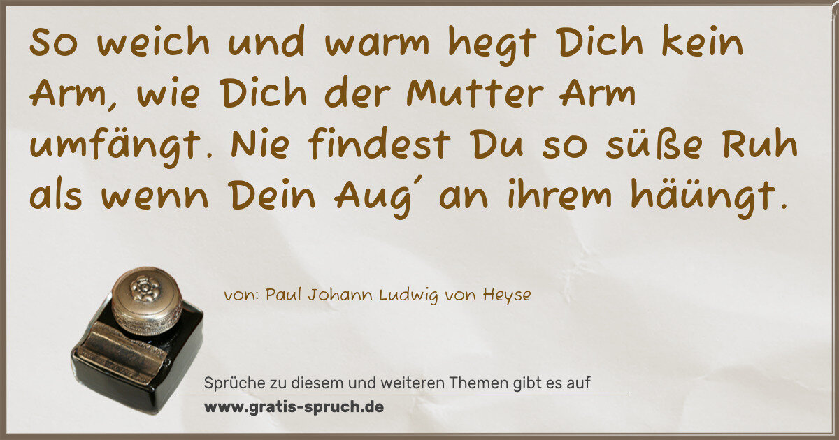 So weich und warm hegt Dich kein Arm, wie Dich der Mutter Arm umfängt. Nie findest Du so süße Ruh als wenn Dein Aug' an ihrem häüngt.