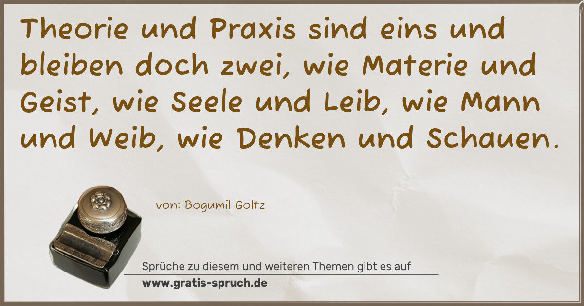 Theorie und Praxis sind eins und bleiben doch zwei, wie Materie und Geist, wie Seele und Leib, wie Mann und Weib, wie Denken und Schauen.
