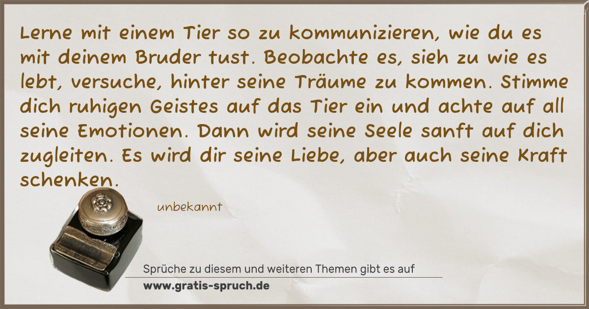 Lerne mit einem Tier so zu kommunizieren, wie du es mit deinem Bruder tust. Beobachte es, sieh zu wie es lebt, versuche, hinter seine Träume zu kommen. Stimme dich ruhigen Geistes auf das Tier ein und achte auf all seine Emotionen. Dann wird seine Seele sanft auf dich zugleiten. Es wird dir seine Liebe, aber auch seine Kraft schenken.