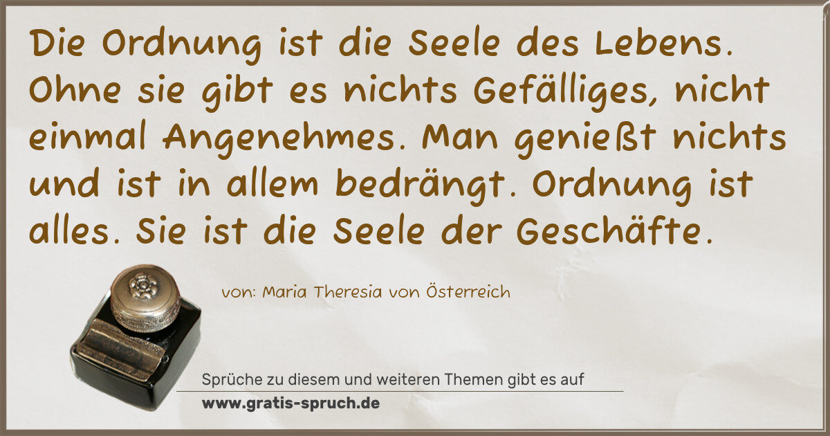 Die Ordnung ist die Seele des Lebens. Ohne sie gibt es nichts Gefälliges, nicht einmal Angenehmes. Man genießt nichts und ist in allem bedrängt. Ordnung ist alles. Sie ist die Seele der Geschäfte.
