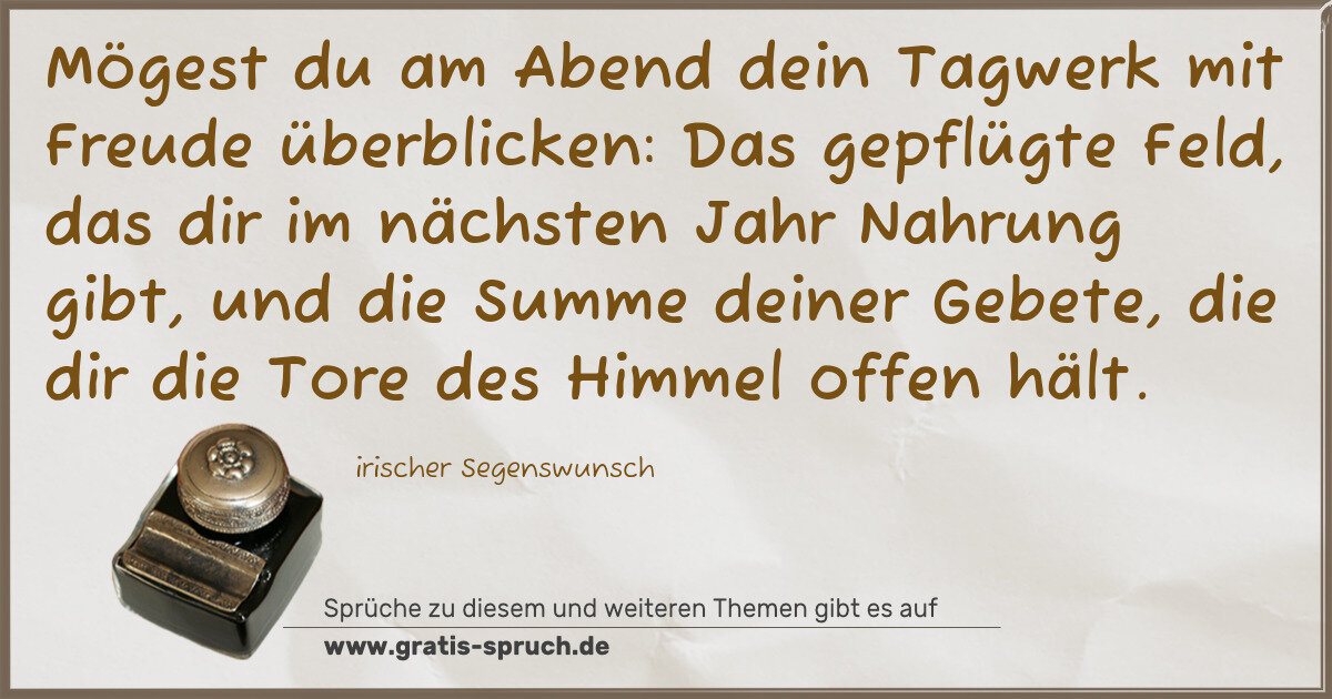 Mögest du am Abend dein Tagwerk mit Freude überblicken: Das gepflügte Feld, das dir im nächsten Jahr Nahrung gibt, und die Summe deiner Gebete, die dir die Tore des Himmel offen hält.