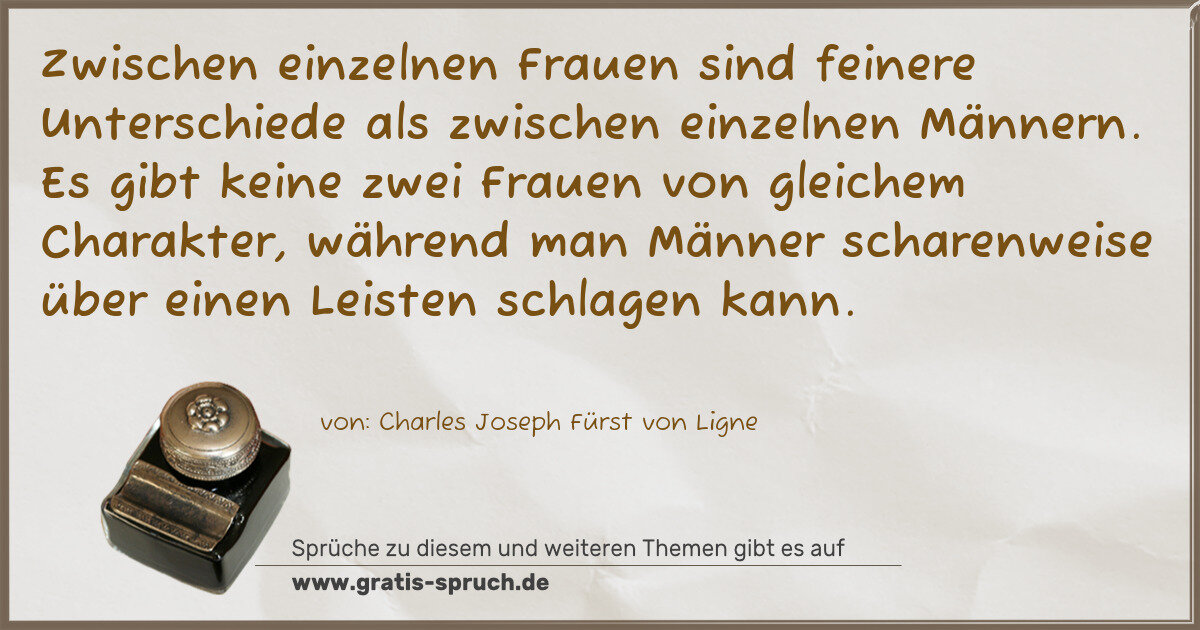 Zwischen einzelnen Frauen sind feinere Unterschiede als zwischen einzelnen Männern. Es gibt keine zwei Frauen von gleichem Charakter, während man Männer scharenweise über einen Leisten schlagen kann.