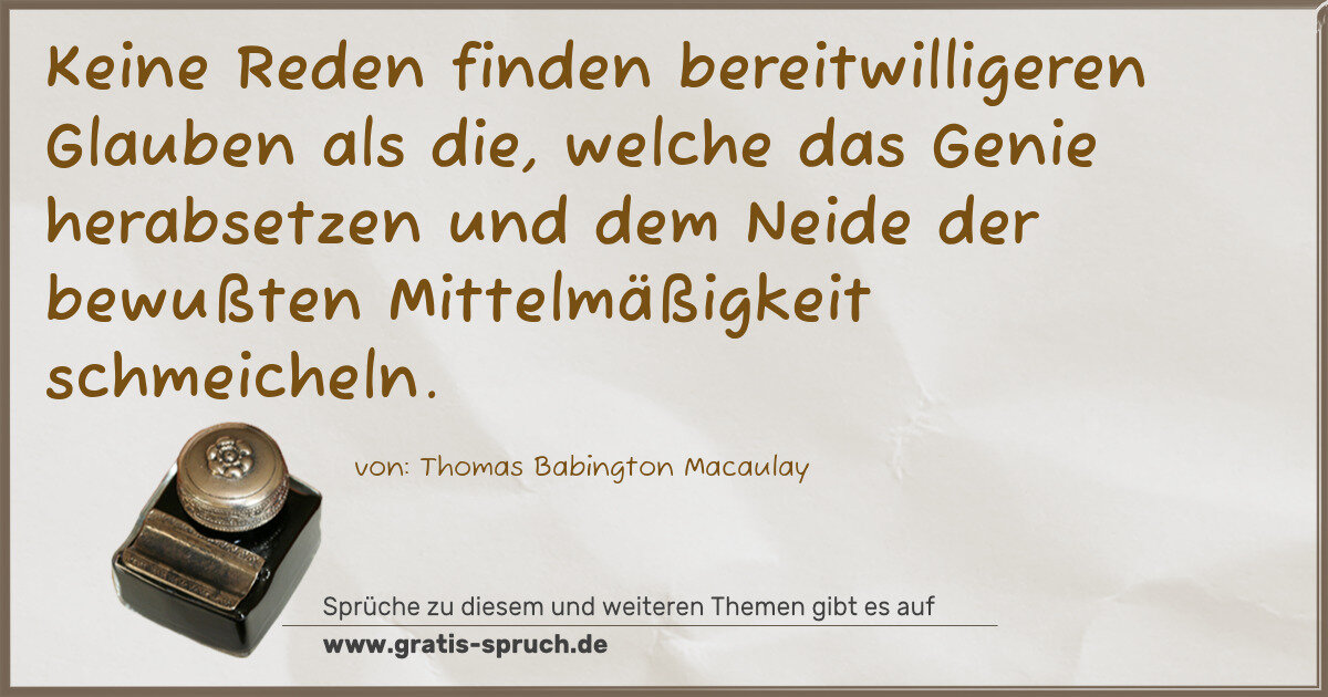 Keine Reden finden bereitwilligeren Glauben als die, welche das Genie herabsetzen und dem Neide der bewußten Mittelmäßigkeit schmeicheln.