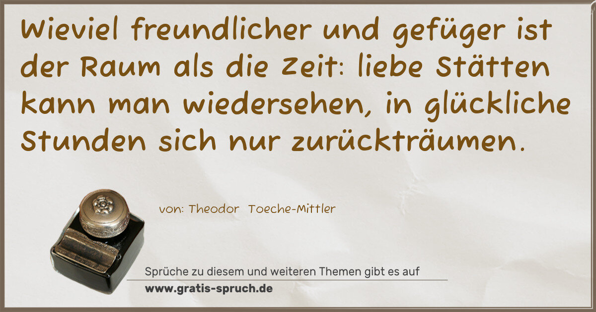 Wieviel freundlicher und gefüger ist der Raum als die Zeit: liebe Stätten kann man wiedersehen, in glückliche Stunden sich nur zurückträumen.
