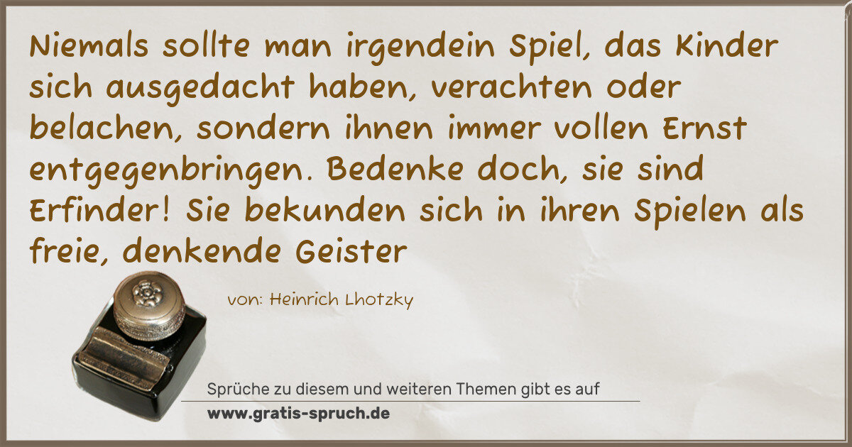 Niemals sollte man irgendein Spiel, das Kinder sich ausgedacht haben, verachten oder belachen, sondern ihnen immer vollen Ernst entgegenbringen. Bedenke doch, sie sind Erfinder! Sie bekunden sich in ihren Spielen als freie, denkende Geister